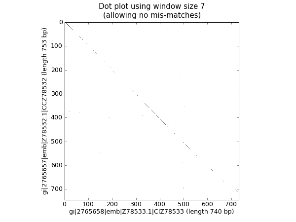 That should pop up a new window showing the graph in Fig. 24. As you might have expected, these two sequences are very similar with a partial line of window sized matches along the diagonal. There are no off diagonal matches which would be indicative of inversions or other interesting events.
