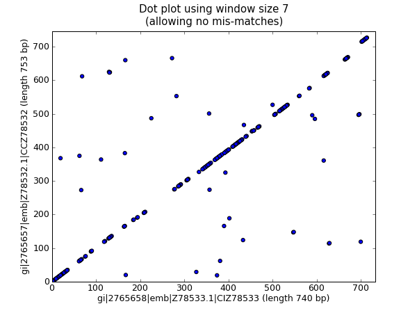 plt.title("Dot plot using window size %i\n(allowing no mis-matches)" % window)